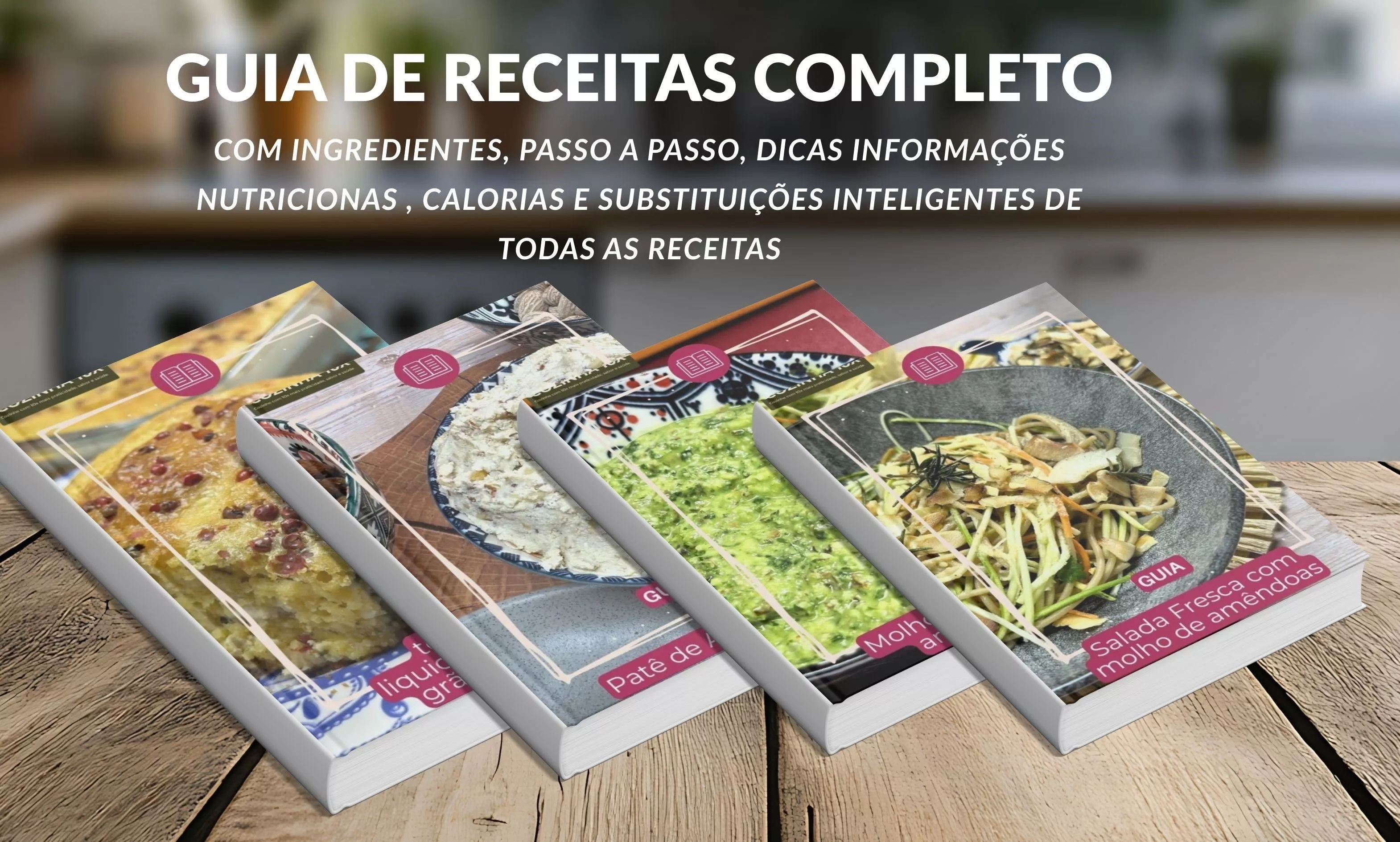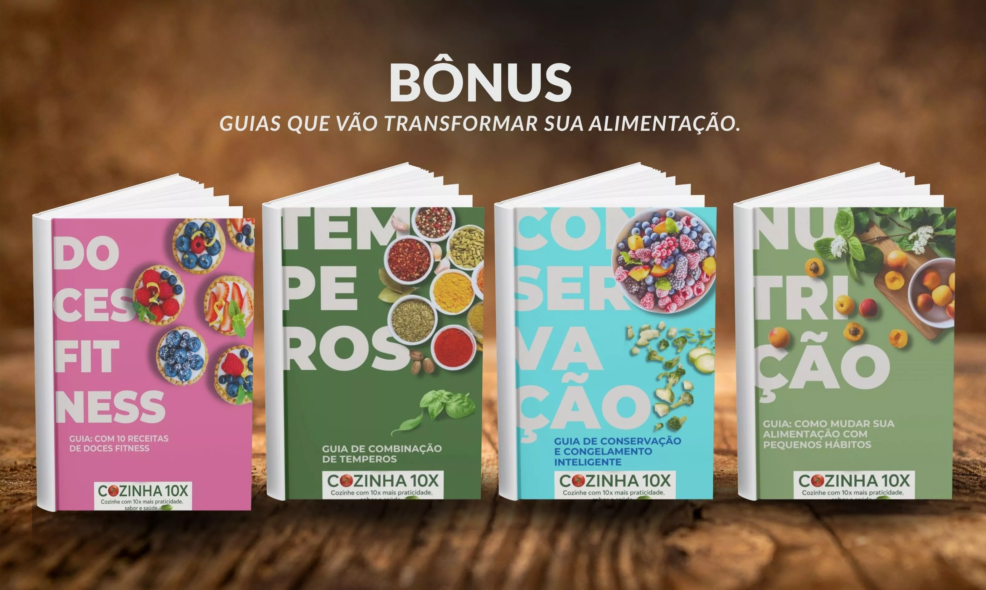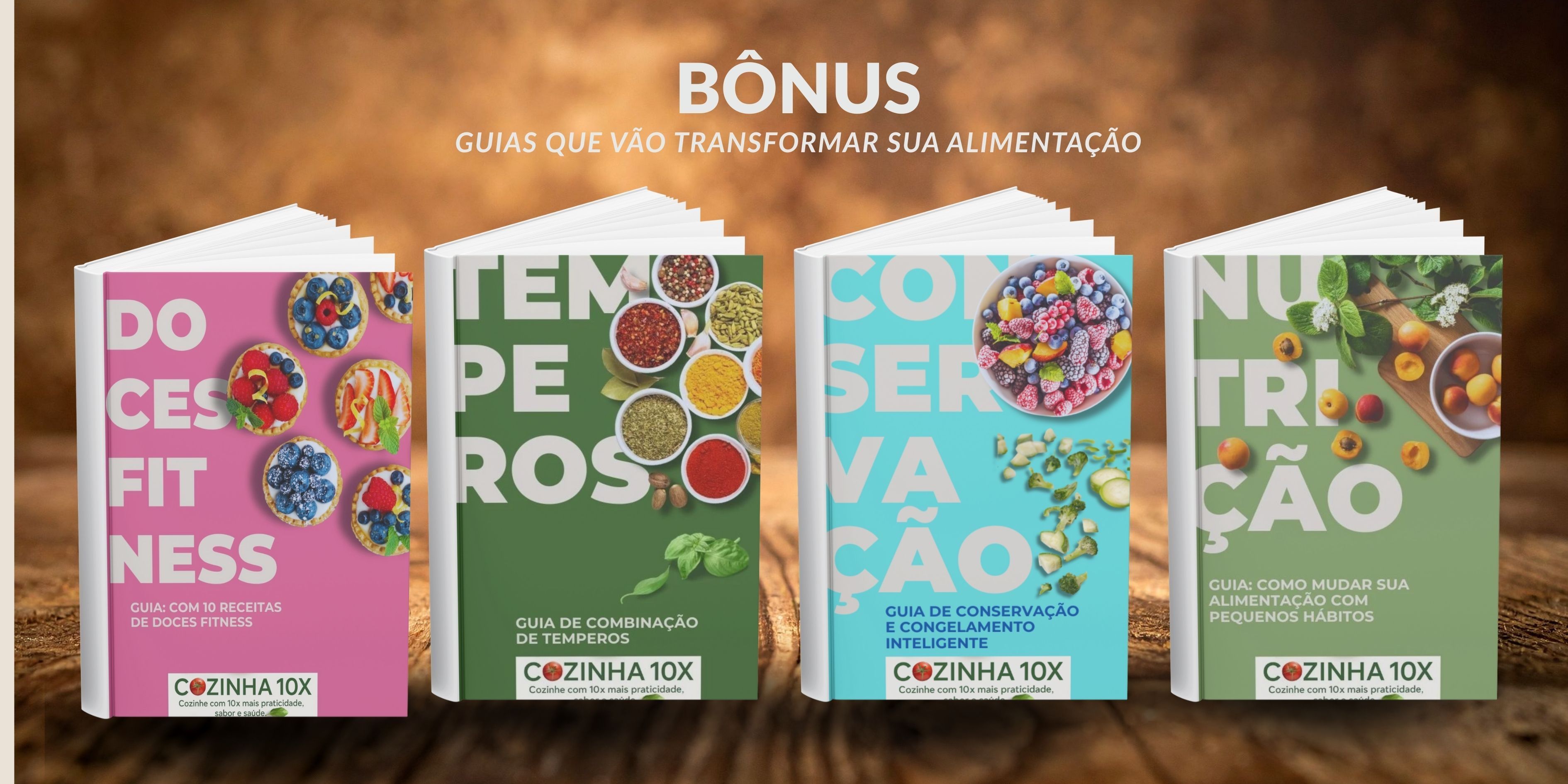 Além do método, você recebe guias exclusivos que, sozinhos, já transformam sua rotina: um eBook com 10 doces fitness, orientações práticas de conservação e congelamento e combinações de temperos para manter sua cozinha natural criativa, organizada e eficiente.